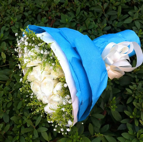 材料包裝: 19支白玫瑰,黃鶯滿天星圍邊豐滿;包裝:藍色皺紋紙圓形包裝