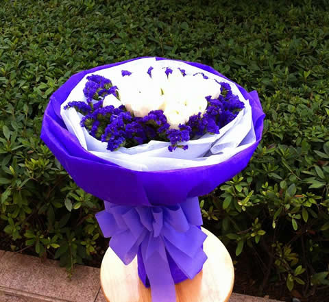 11枝白玫瑰,紫色勿忘我圍邊豐滿;包裝:紫色皺紋紙圓形包裝