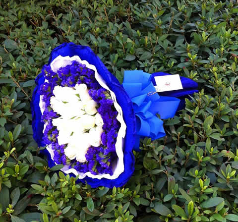 商品簡介:19枝白玫瑰,紫色勿忘我圍邊豐滿;包裝:藍(lán)色卷邊紙圓形包裝