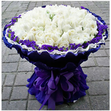 商品簡介:99朵白玫瑰 勿忘我圍繞 紫色包裝