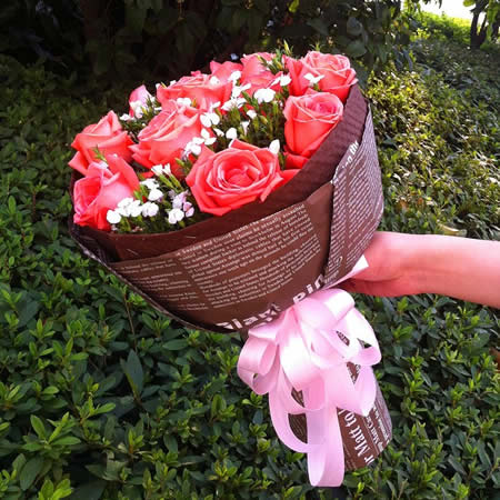 11枝粉玫瑰 滿天星點綴 圓形包裝 粉色蝴蝶結扎尾