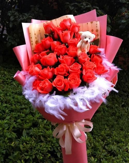 33枝粉玫瑰 粉色扇形 羽毛搭配 可愛小熊1枝 米色 蝴蝶結