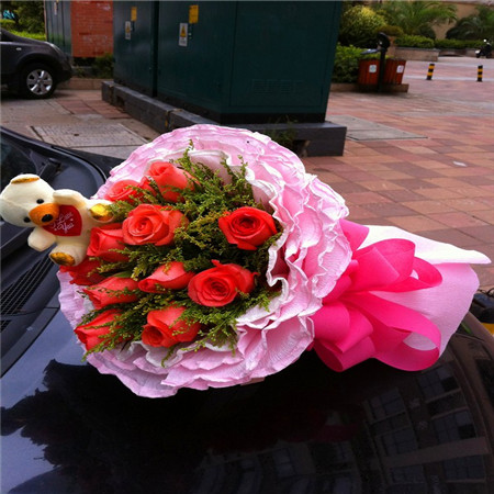 商品簡(jiǎn)介:11枝粉玫瑰 黃鶯點(diǎn)綴 小熊1只 粉色卷邊紙 包裝