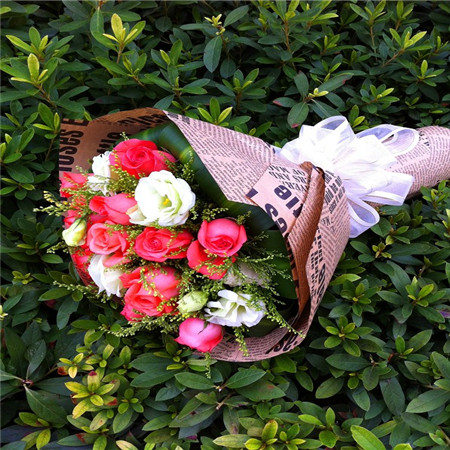 商品簡介:11枝粉玫瑰 4枝白玫瑰 黃鶯點綴 報紙圓形包裝 白色紗網結尾