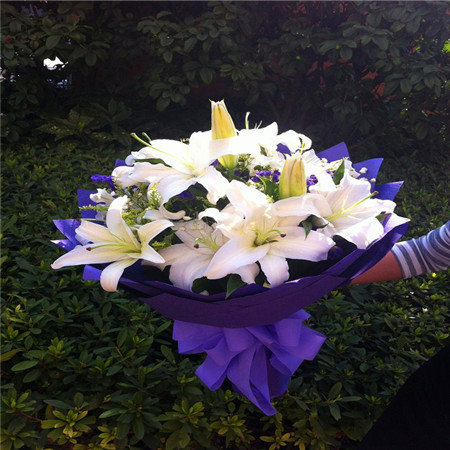 白色香水百合9支,滿天星,黃鶯,勿忘我點綴;商品包裝:深紫色包裝紙多層包裝