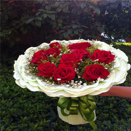 紅玫瑰11枝 滿天星 商品包裝:淡色皺紋紙圓形包裝