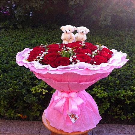 19支精品昆明A級紅玫瑰+滿天星點綴+可愛小熊公仔2只 內襯淡粉色棉紙 外圍精美粉色裙邊包裝