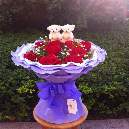 11支精品昆明A級紅玫瑰+滿天星點綴+可愛小熊公仔2只 三層紫色皺紋紙包裝