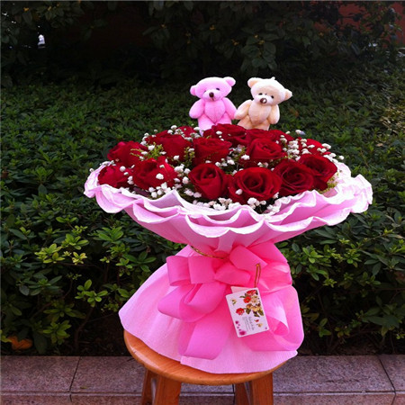 商品簡(jiǎn)介:19支精品紅玫瑰+滿天星點(diǎn)綴+可愛小熊公仔2只 粉色皺紋紙包裝