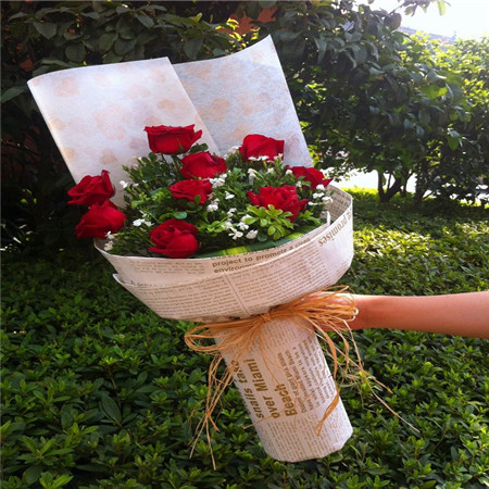 9枝紅玫瑰 配草豐滿 包 裝: 經(jīng)典舊報(bào)紙手揉紙包裝