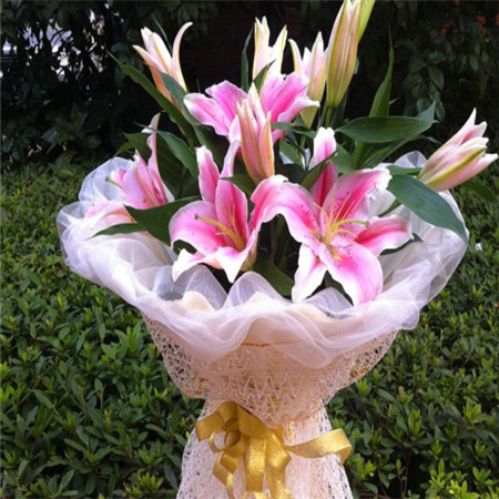 商品簡介:多頭粉百合4支;商品包裝:里面白色網紗,外面淡黃色網紗包裝,金黃色絲帶蝴蝶節扎束