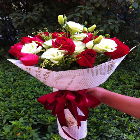 商品簡介:21朵昆明A級紅玫瑰+9朵精美白玫瑰+黃鶯搭配. 經典舊報紙手揉紙包裝,深紅色絲帶花結