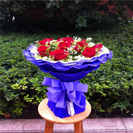 12支紅玫瑰+黃鶯點綴+情人草 內(nèi)襯淡色棉紙 外圍精美藍色裙邊包裝