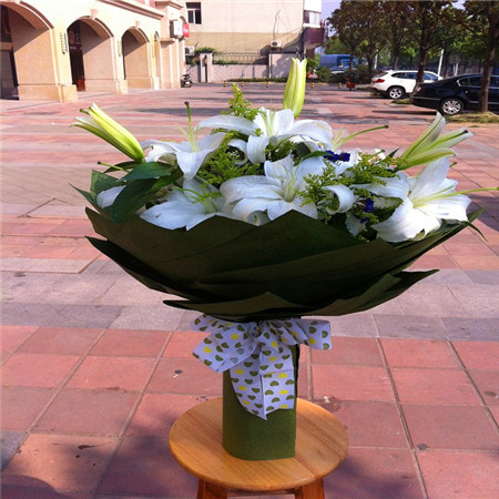 多頭白百合4支,黃鶯,勿忘我間插;商品包裝:綠色包裝紙多層包裝,用絲帶蝴蝶結(jié)扎束