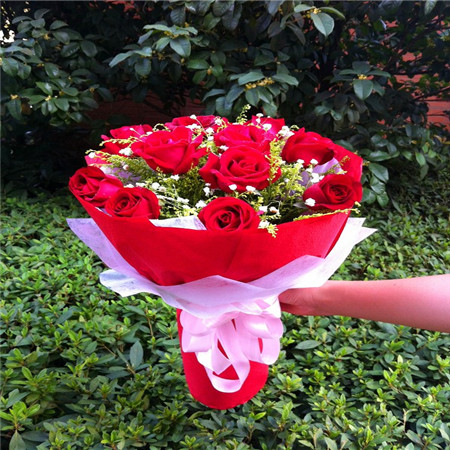 16朵紅玫瑰、滿天星、黃鶯搭配;包裝:紅色綿紙內襯,白色綿紙外圍.粉色絲帶扎束