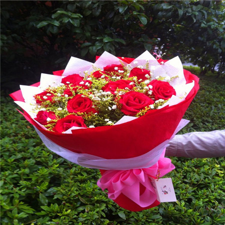 商品簡介:12支紅玫瑰+滿天星點綴 商品包裝:紅色皺紋紙圓形包裝