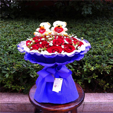 紅玫瑰21支+滿天星點(diǎn)綴+2只可愛小熊 包裝:白色棉紙內(nèi)襯 外圍藍(lán)色皺紋紙包裝