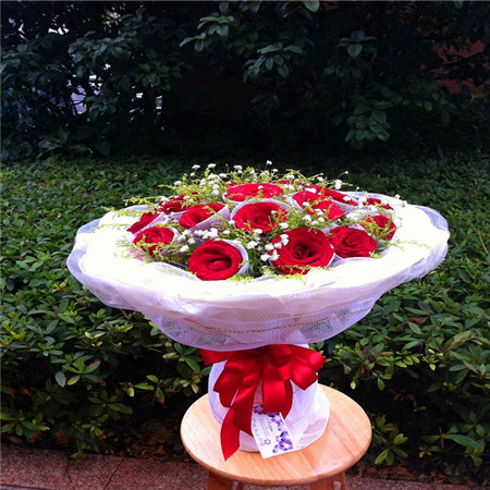 19朵紅玫瑰,滿天星豐滿.白色紗網(wǎng)圓形包裝,紅色花結(jié)束扎.