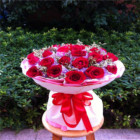 材料包裝: 24枝紅玫瑰獨立包裝 滿天星點綴 包裝:粉色皺紋紙圓形包裝 紅色絲帶扎束 24朵:思念、純潔的愛