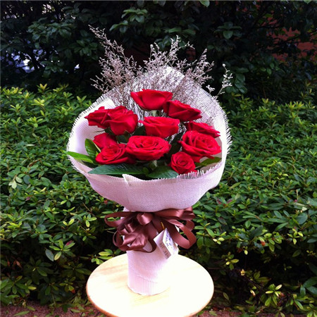 9支紅玫瑰 配草 包裝:白色包裝,咖啡色絲帶扎束