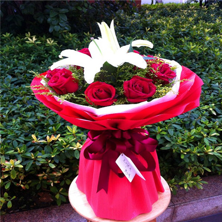 商品簡介:11支紅色玫瑰 1支多頭百合 包裝:白色皺紋紙內襯 紅色皺紋紙外圍圓形包裝