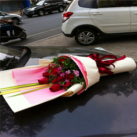 11支紅玫瑰 配草 包裝:淺色皺紋紙扇形包裝