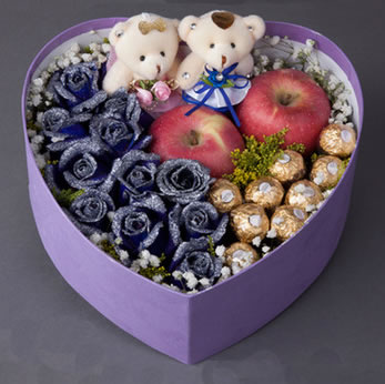 9朵藍色妖姬+9顆巧克力+2個平安果+兩個小熊。精美禮盒