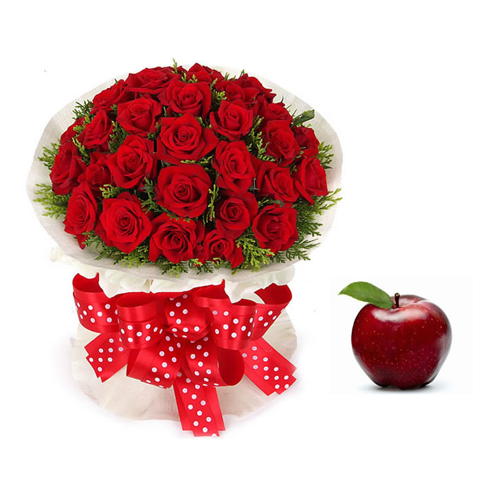 商品簡介:21朵紅玫瑰,黃鶯適量點綴,粉色裙邊紙圓形包裝 加一個平安果