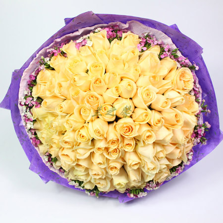 商品簡介:99朵香檳玫瑰+2只小熊 黃鶯加綠葉圍繞 棕色包裝 絲帶結尾