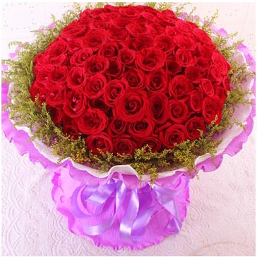 花材:99枝紅玫瑰,黃鶯點(diǎn)綴豐滿,包裝:白色與紫色卷邊紙圓形包裝,紫色絲帶打結(jié)