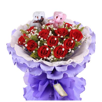 11紅玫瑰+2只卡通小熊,黃鶯滿天星點(diǎn)綴,精美紫色卷紙包裝