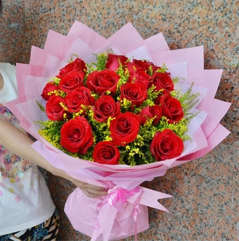19朵紅玫瑰,黃鶯搭配,內用白色瓦楞紙,外用粉色瓦楞紙尖角包裝,粉色蝴蝶結。