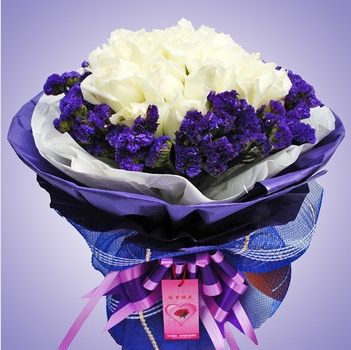 商品簡介:11支白玫瑰,紫色勿忘我圍邊,紫/白包裝紙,精美包裝