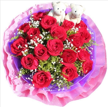 商品簡介:11支紅玫瑰,間插滿天星、黃鶯 + 2只卡通小熊;包裝:內(nèi)襯紫色綿紙,外3層粉色卷邊紙圓形包裝,搭配粉色蝴蝶結(jié)