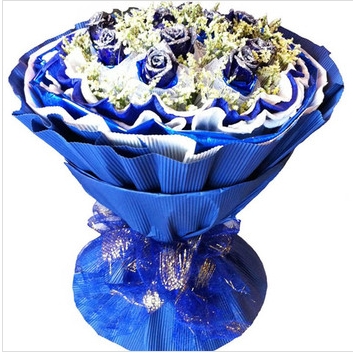 11枝藍(lán)玫瑰,白色紗網(wǎng)單獨(dú)包裝,滿天星、配草間插。包裝:淡藍(lán)色、寶石藍(lán)色卷邊紙和瓦楞紙多層圓形精美包裝,寶石藍(lán)色紗網(wǎng)束扎