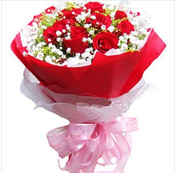11枝紅玫瑰,滿天星黃鶯點綴;包裝:粉色綿紙內層包裝,紅色手揉紙外層圓形包裝,粉色綿紙外層圍繞,點綴同色系蝴蝶結裝飾物