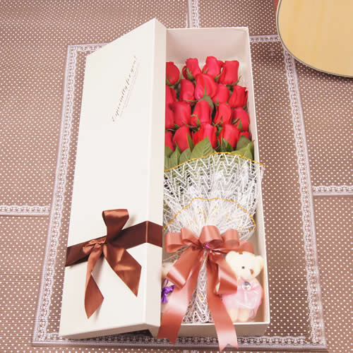材料包裝: 花材:19朵紅玫瑰,梔子葉搭配;包裝:白色網紗,高端白色禮盒。