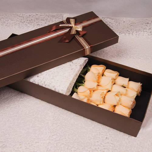 材料包裝: 花材:19朵香檳玫瑰;包裝:白色網(wǎng)紗包裝。高端咖啡色禮盒裝。