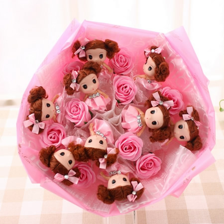 公仔數(shù)量:9只迷糊娃娃+9香皂花手捧 材料:香皂,霧光紙,紗網 尺寸:高40CM,直徑35CM