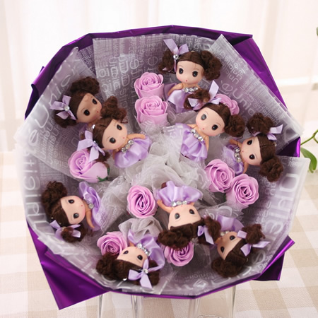 公仔數(shù)量:9只迷糊娃娃+9香皂花手捧 材料:香皂,霧光紙,紗網(wǎng) 尺寸:高40CM,直徑35CM