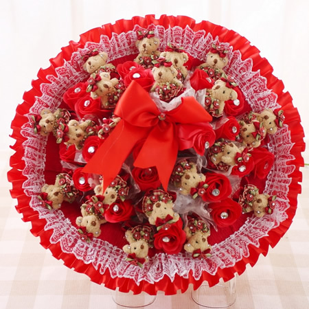 商品簡(jiǎn)介:公仔數(shù)量:21只8CM高檔熊+21香皂花 材料:蕾絲,紗,卷紙,香皂,鉆飾,絲帶。尺寸:高45CM,直徑45CM