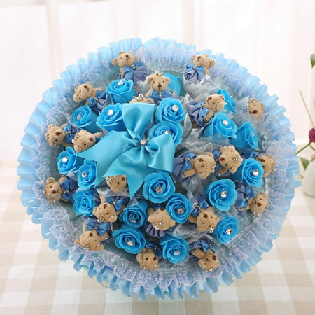 公仔數(shù)量:21只8CM高檔熊+21香皂花 材料:蕾絲,紗,卷紙,香皂,鉆飾,絲帶。尺寸:高45CM,直徑45CM
