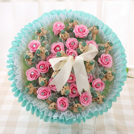 材料包裝: 公仔數量:21只8CM高檔熊+21香皂花 材料:蕾絲,紗,卷紙,香皂,鉆飾,絲帶。尺寸:高45CM,直徑45CM
