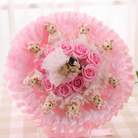 公仔數(shù)量:1對婚紗高檔熊+9只小熊+9朵香皂花 材料:蕾絲,紗,卷紙,香皂,鉆飾,絲帶 尺寸:高45CM,直徑40CM
