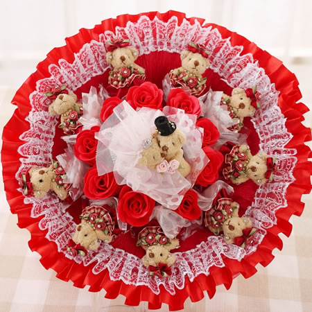 材料包裝: 公仔數量:1對婚紗高檔熊+9只小熊+9朵香皂花 材料:蕾絲,紗,卷紙,香皂,鉆飾,絲帶 尺寸:高45CM,直徑40CM