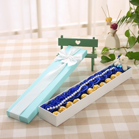 商品簡介:產品包含:11朵香皂花,11顆費列羅巧克力 禮盒尺寸:長44*寬8.5*高4.5CM