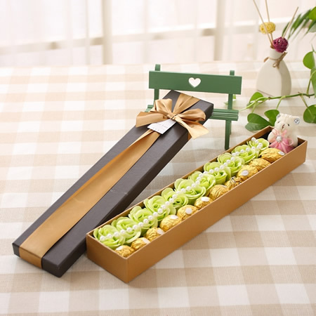 商品簡介:產品包含:11朵香皂花,11顆費列羅巧克力 禮盒尺寸:長44*寬8.5*高4.5CM