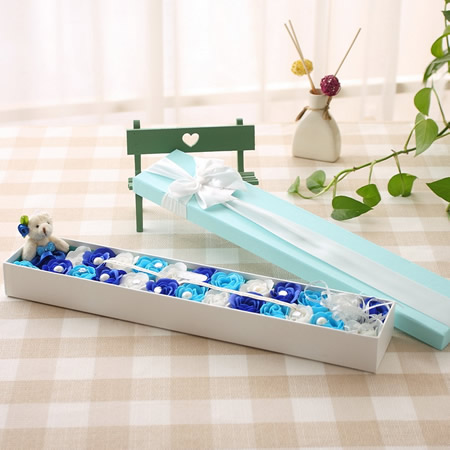 材料包裝: 產(chǎn)品介紹:25朵香皂花+小熊 顏色:深藍(lán)+淺藍(lán)+白 長(zhǎng)44*寬8.5*高4.5CM