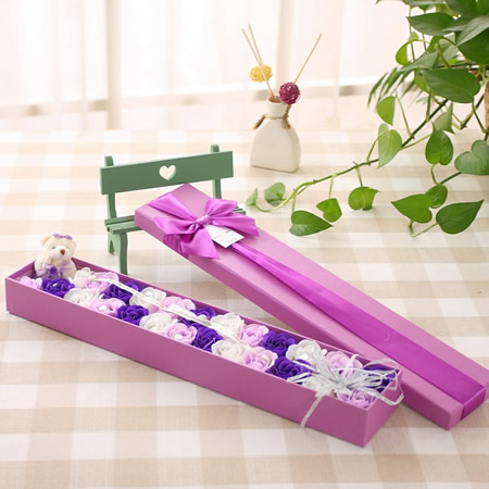 產品介紹:25朵香皂花+小熊 顏色:深紫+淺紫+白 長44*寬8.5*高4.5CM