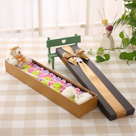 商品簡介:產品介紹:33朵朵香皂花+仙女熊 顏色:綠+粉+淺紫 長46*寬10*高6CM